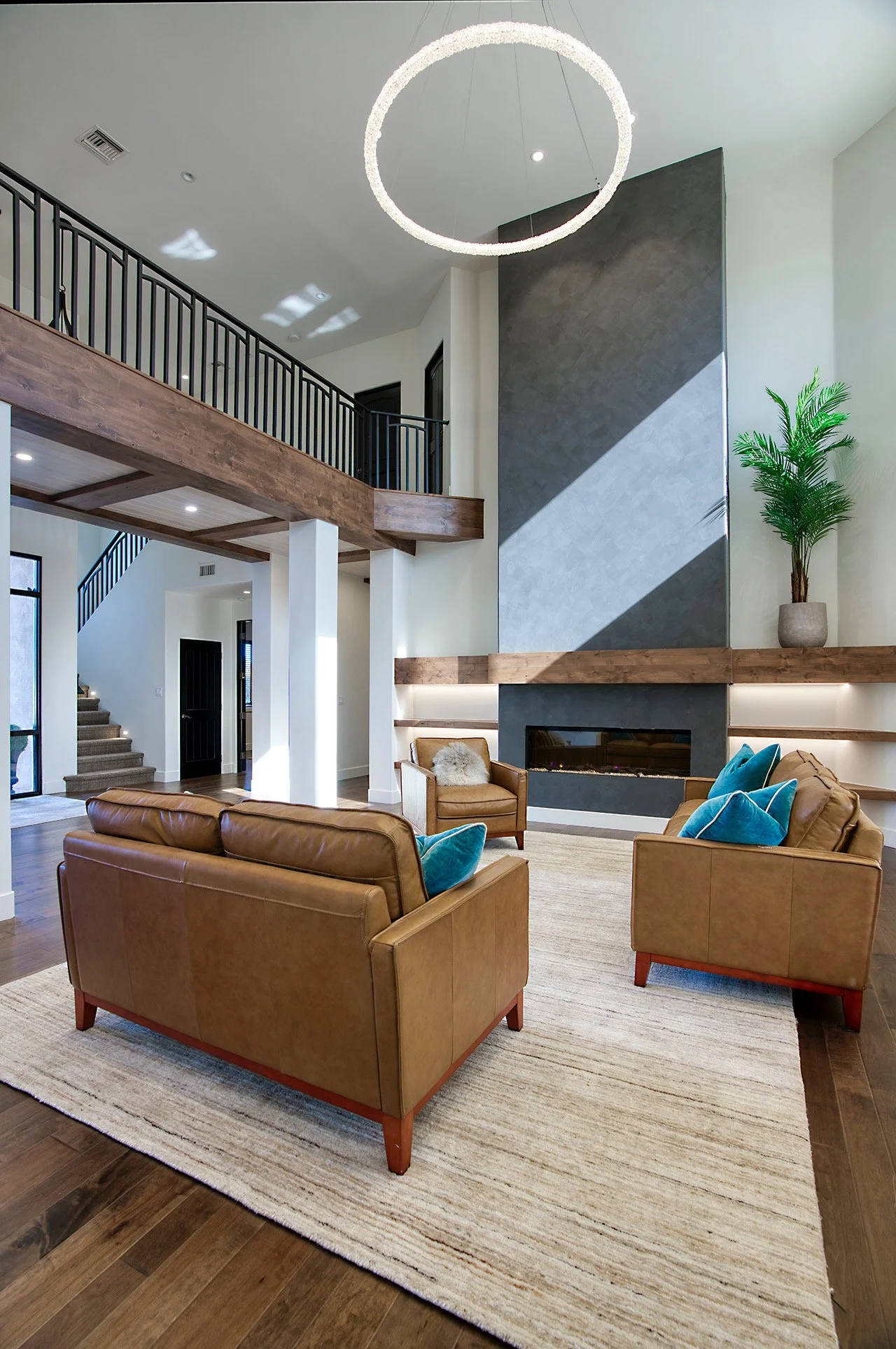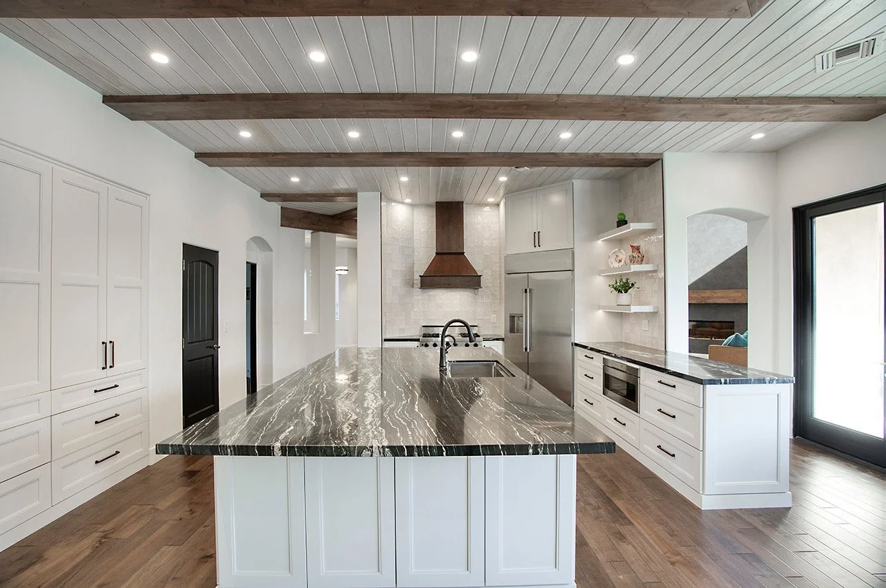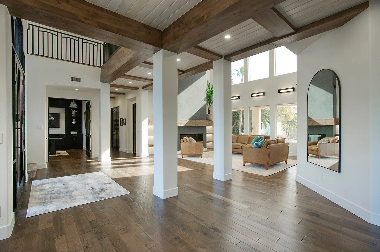 This remodel brought the interior finishes up to date and added a new sophistication to a family home using high contrast between white walls and dark wood flooring, with a white-washed wood ceiling and cabinets.